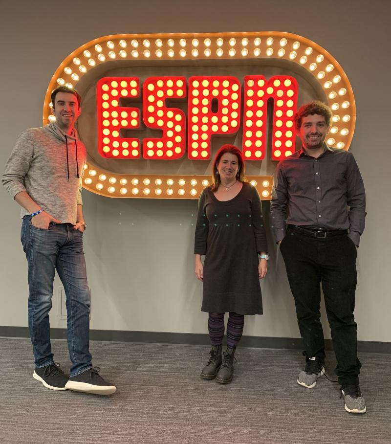 "The ESPN—Ithaca College Park School of Communications connection is strong. Three producers in ESPN's Emmy Award-winning features unit graduated from IC. All three of us got our start on Butterfield Field working on Gridiron Report and Bombers Football. We now travel to Lambeau Field, Gillette Stadium, Arrowhead Stadium, and everywhere in between, producing NFL features for ESPN. Gavin Cote (left)—class of 2012—has been on NFL for five years and has won numerous awards for his work. Josh Vorensky (right)—class of 2011—recently served as field producer for ESPN's Special Olympics coverage in Abu Dhabi. This is my second stint with NFL and I'm proud to work with fellow Bombers and have them as teammates. The culture of hard work and collaboration is strong and makes all the difference. Look for our work during the Super Bowl on Sunday NFL Countdown."