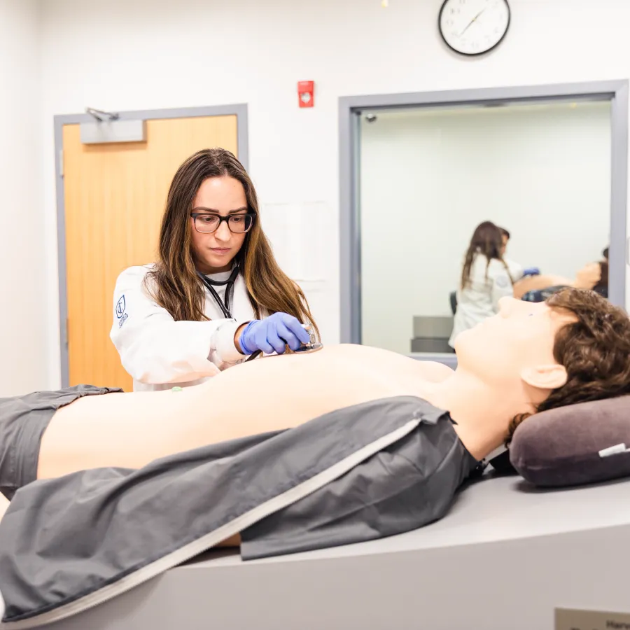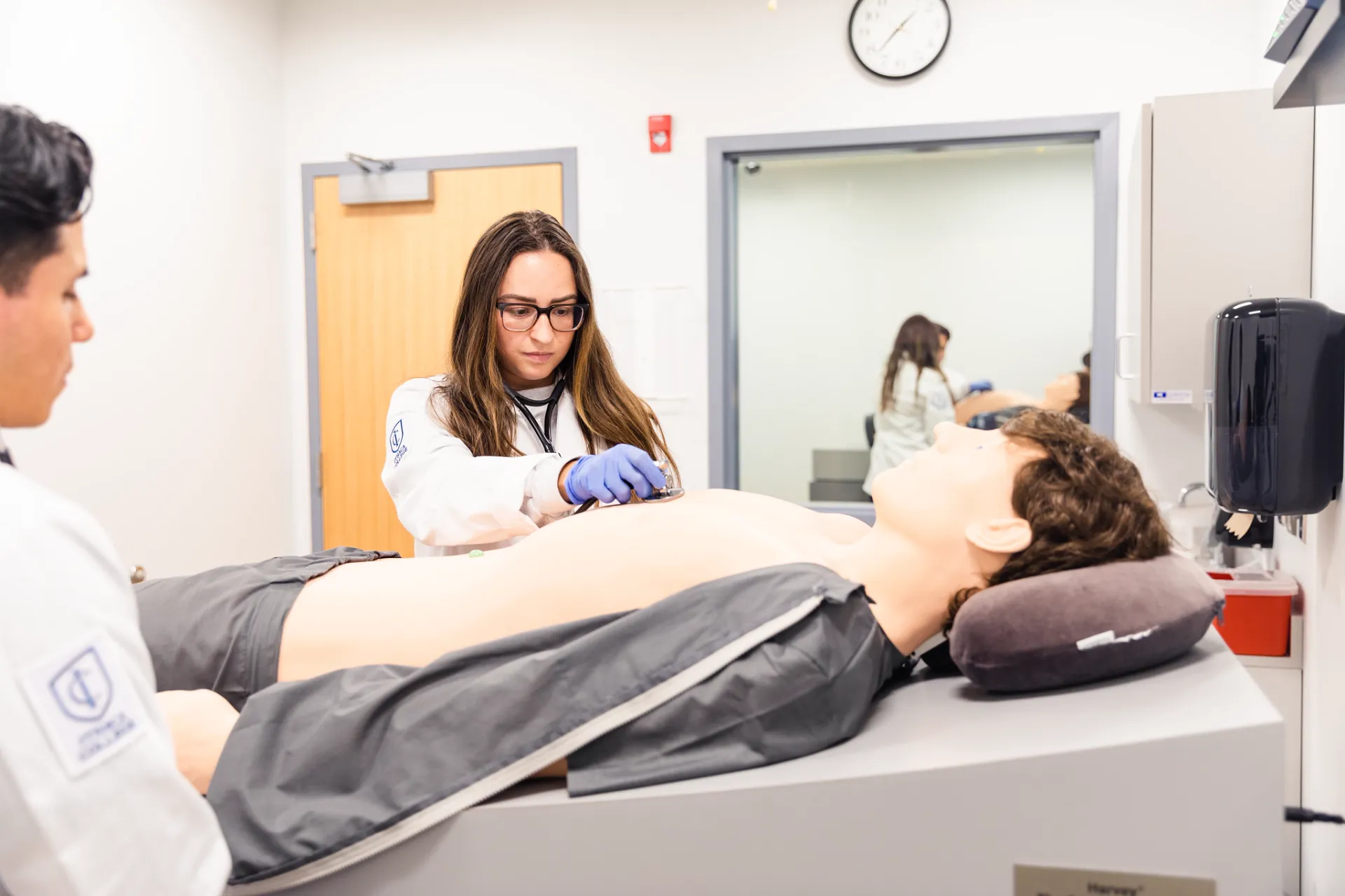 Learners working with Harvey; The Cardiopulmonary Patient Simulator, in the Center for Medical Simulation, located in the Physician Assistant building.