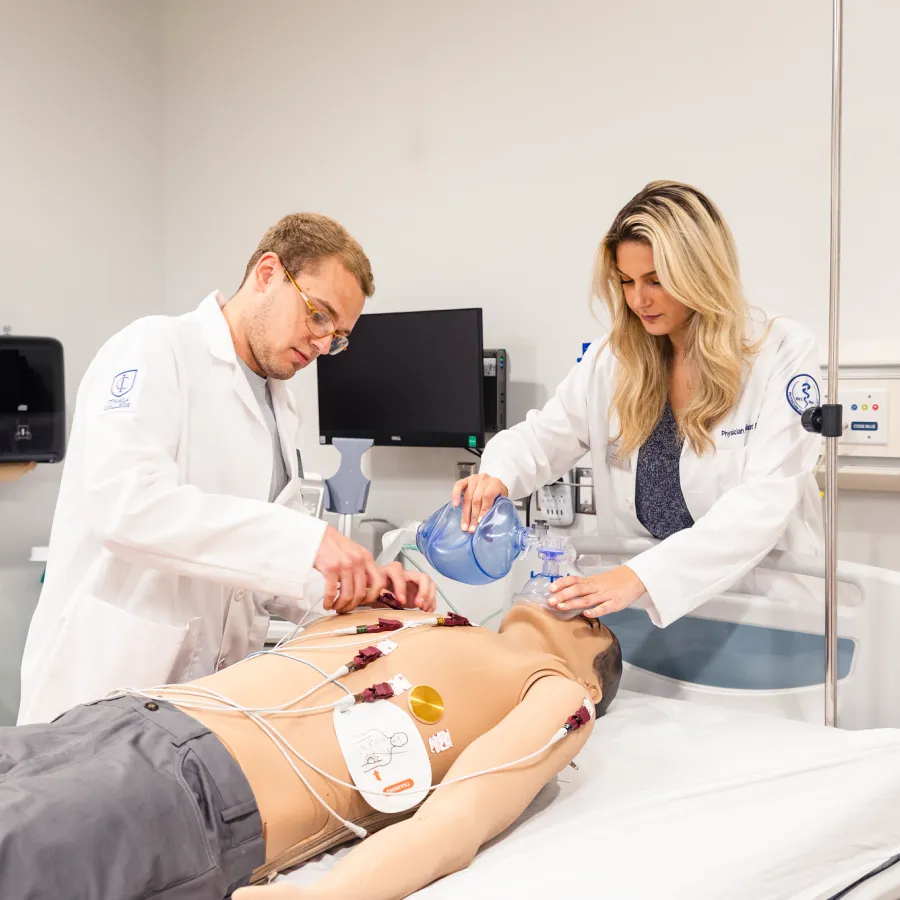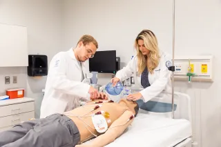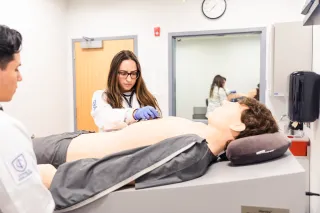 Learners working on our Laerdal Sim Man 3G in a patient room within the Center for Medical Simulation, located in the Physician Assistant building.