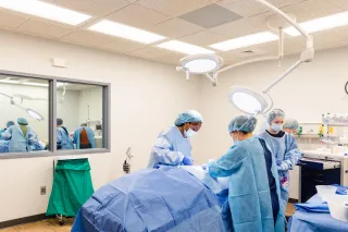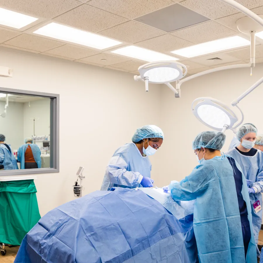 Learners working with a medical simulator in the operating theater within the Center for Medical Simulation, located in the Physician Assistant building.
