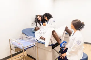 Learners working with our Laerdal SimMom and birthing baby in the Center for Medical Simulation, located in the Physician Assistant building.