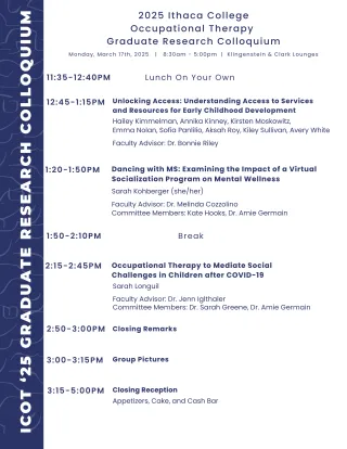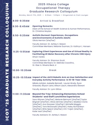 Please join us for the culminating event of our Ithaca College Occupational Therapy Graduate Students as they present the research that they have been working on both in groups and individually.