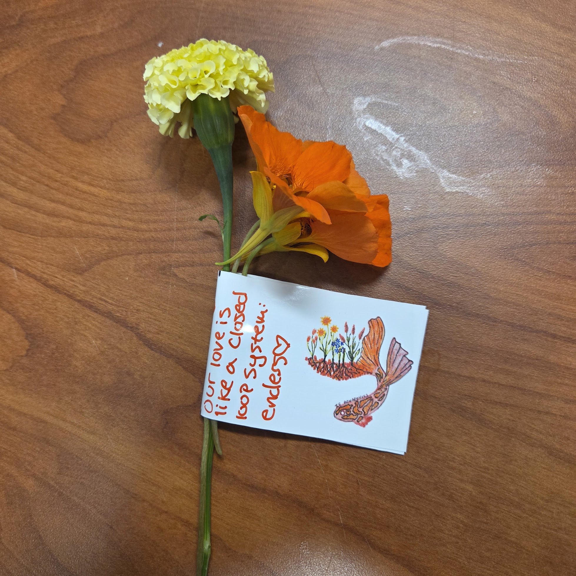Ellory Steinback from the Aquaponics Research Team has been experimenting with growing flowers as a way to diversify the types of products that can be grown organically in an aquaponics system. (The flower production industry is notorious for using high concentrations of pesticides). Just in time for Valentine’s day, the flower experiment yielded enough flowers to share with the Ithaca College community. The Aquaponics Research Team delivered these flowers with their own versions of Valentine’s messages:
