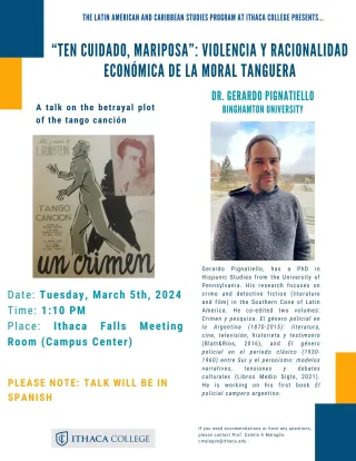 Dr. Pignatiello will discuss the betrayal plot in tango, and how it explains a variety of relationships: friendship, love, fidelity to the neighborhood, and economic exploitation. To avoid these betrayals, tango lyrics can advise, threaten, or kill. The presentation will explore the representation of these different types of violence in the Golden Age of "tango canción", 1916-1955.