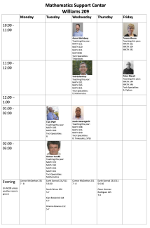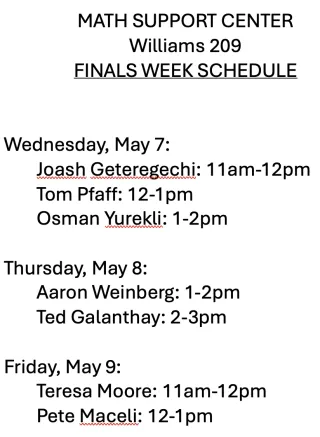 The mathematics faculty is committed to the success of all students enrolled in courses that use mathematics. Free tutoring is available during the daytime hours Tuesday-Friday in the Mathematics Support Center (Williams 209) by mathematics faculty, and most 100-level courses have a dedicated TA with evening help hours. See the schedule below for tutoring times. Students may also use the room as a place to study or read.