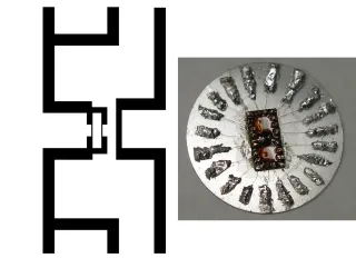 SQUID geometry and chip. The SQUID loop is about 10 microns wide and 30 microns long (left image). The sample itself is 5 mm wide by 10 mm long (right image). Design and photo by Charlie Strehlow '09