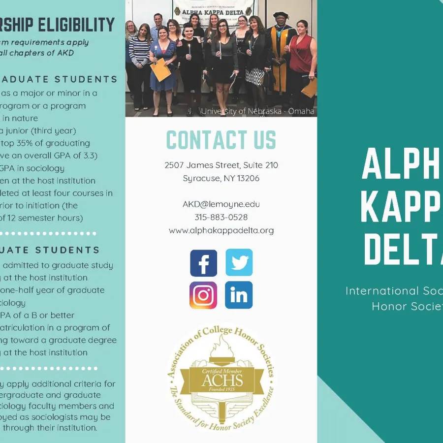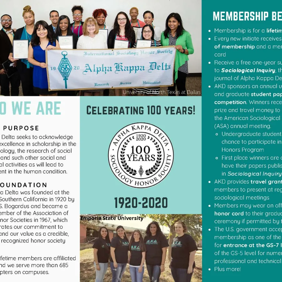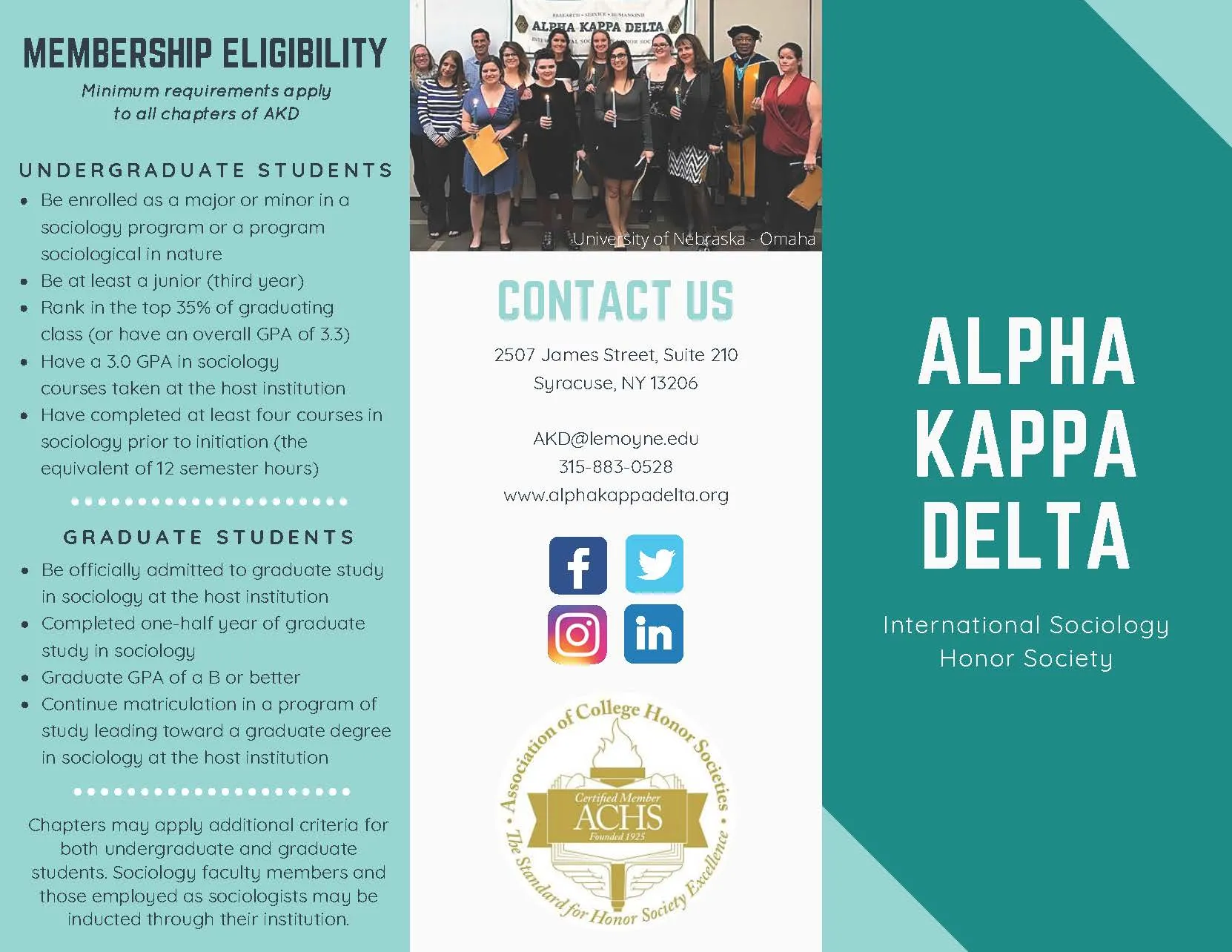 Why join AKD? Becoming a member provides you with advantages described below. Among which, the benefit of further establishing your dedication to sociology and academic success to employers (adding this distinguished accomplishment to your resume); graduate programs; or other interested parties. One's membership offers funding opportunities to attend conferences; a subscription to the journal, Sociological Inquiry; and even an entitlement to substantial pay increases if you become a government employee.
