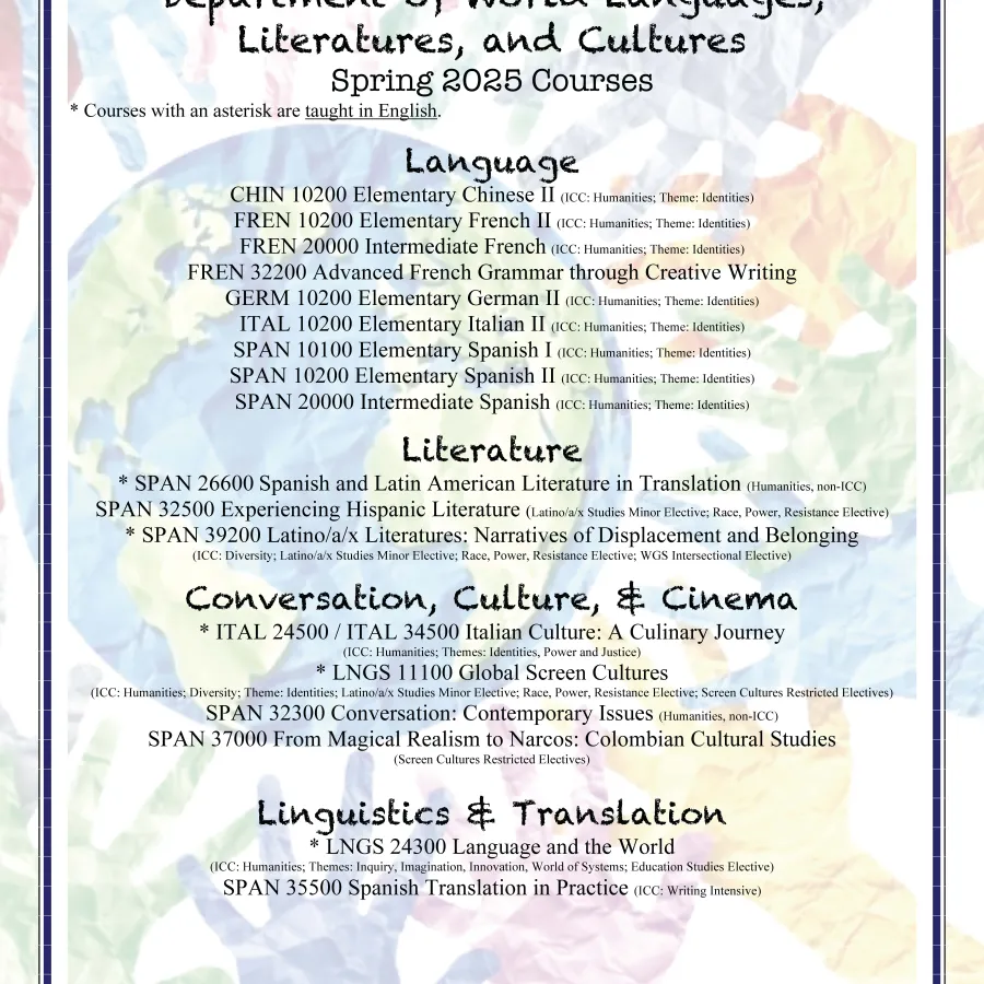 Ithaca’s Department of World Languages, Literatures, and Cultures (DWLLC) offers a bachelor of arts degree in World Languages and Cultures, with curricula in French and Francophone Studies, German Area Studies, Italian Studies, and Spanish. Our innovative and interdisciplinary major provides students with multiple pathways to completion, either by pursuing expertise in a single language or by combining the study of a primary language with additional coursework in a second language as well courses in linguistics and translation studies. The department also offers minors in French, German, Italian, Spanish, and translation studies as well as courses in Chinese.