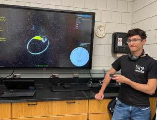 Yash Mohod shows off his mechanics modeling project on the sensitivity of a astrophysical double pendulum system to initial conditions