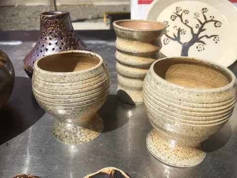 Three fifteenth-century style drinking vessels, modelled on examples from France. These cups are salt-glazed.
