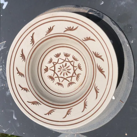 This is a reproduction of a ceramic dish from sixteenth century Pisa. It is made with a technique called sgraffito, where a design is cut through an over layer of white slip to reveal the darker red clay beneath.