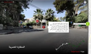 The project also includes an interactive map called a "remapping of Jerusalem" with historical information and images. The basemap is color-coded to indicate buildings constructed before or after the Nakba, as well as ones that have been identified as houses of particular families, embassies, factories, monasteries, and so forth. Most include photographs of the present; some also include archival photographs from the past. The project continues to remap these neighborhoods, house by house.