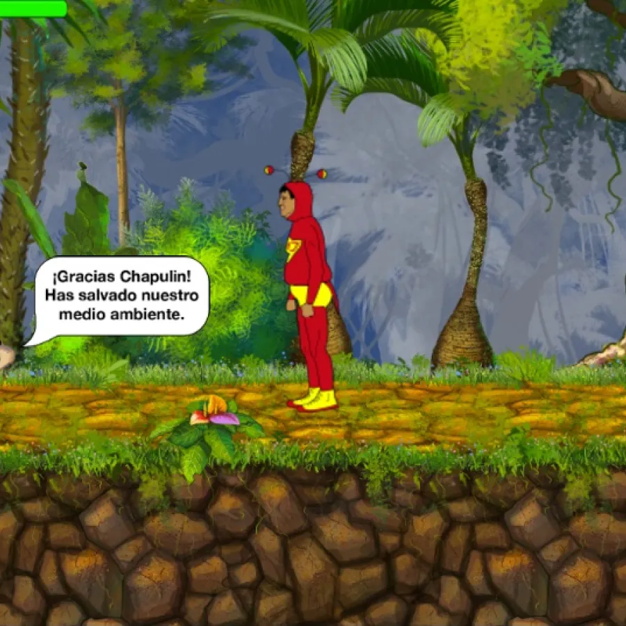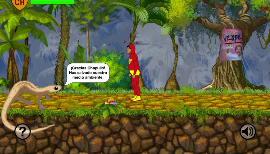To play, users navigate through the island’s lush forest with an animated avatar of El Chapulín Colorado ("The Red Grasshopper") from the long-running Mexican television comedy, created by Roberto Gómez Bolaños (aka Chespirito) as parody of superhero series. When El Chapulín throws his trusty weapon Chipotle Chillón ("squeaky mallet") to hit Ortega wearing red sparring gear, Wang driving a spaceship-capped bulldozer, or other obstacles, they explode. When the player bypasses them, he frees the country—and is sometimes thanked by the lungless salamander (Bolitoglossa insularis), an indigenous creature.