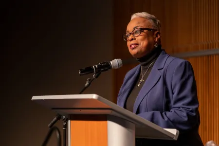 La Jerne Terry Cornish speaks to graduates, family members, and supporters at a 2019 reception for December graduates.