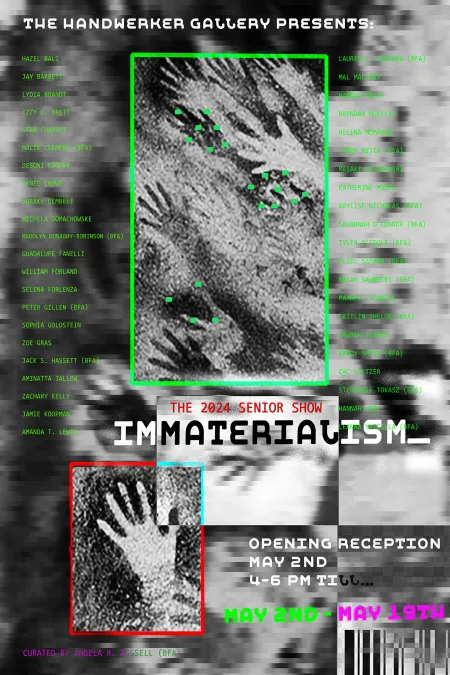The Handwerker Gallery is pleased to work with guest curator and graduating senior Angela Russell '24 on IMMATERIALISM_ a Senior Art Show. This year's annual exhibition showcases the work of forty-three graduating seniors studying at Ithaca College. Participating artists come from Art, Art History, & Architecture, The Roy H. Park School of Communications, and beyond. This year’s exhibition extends throughout all three of our galleries and features painting and drawing, sculpture, photo, video, and more. The IMMATERIALISM_artists are:Hazel Bali,Jay Barrett, Lydia Brandt, Izzy O. Brett,Star Chapski,Malik Clement (BFA),Desoni Cooper,Renée Crowe, Sarake Dembele, Michela Domachowske, Madolyn Donaghy-Robinson (BFA), Guadalupe Fanelli, William Forlano, Selena Forlenza, Peter Gillen (BFA), Sophia Goldstein, Zoe Gras, Jack S. Hassett (BFA), Aminatta Jallow, Zachary Kelly, Jamie Koopman, Amanda T. Lewis, Lauren J. Lubenow (BFA), Mal Mallory, Hannah Maloy, Brendan McKelvy, Helena McMahon, Jimmy Mejia (BFA), Masaki Mitsuhashi, Katherine Moore, Adylise Nicholas (BFA), Savannah O'Connor (BFA), Tyler O'Toole (BFA), Eliel Safran (BFA), Nolan Saunders (BFA), Maxwell Schweik, Caitlin Shelor (BFA), Lauren Sieber, Brody Smith (BFA), Zac Sultzer, Stephanie Tokasz (BFA), Hannah Wool, and Leanna Yatcilla (BFA).