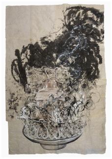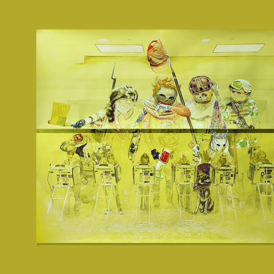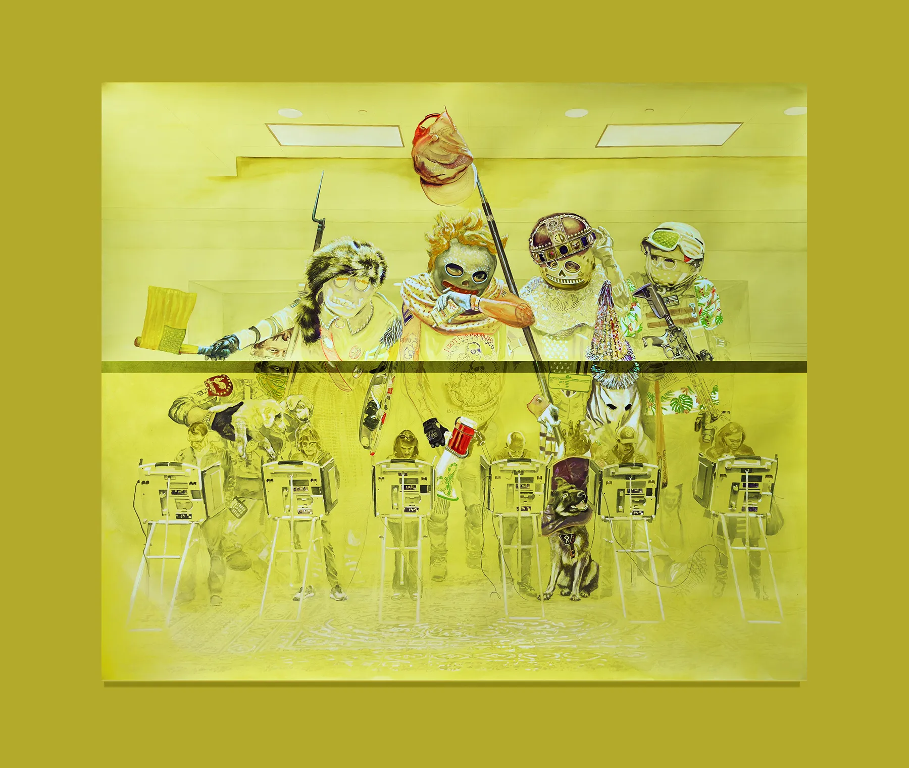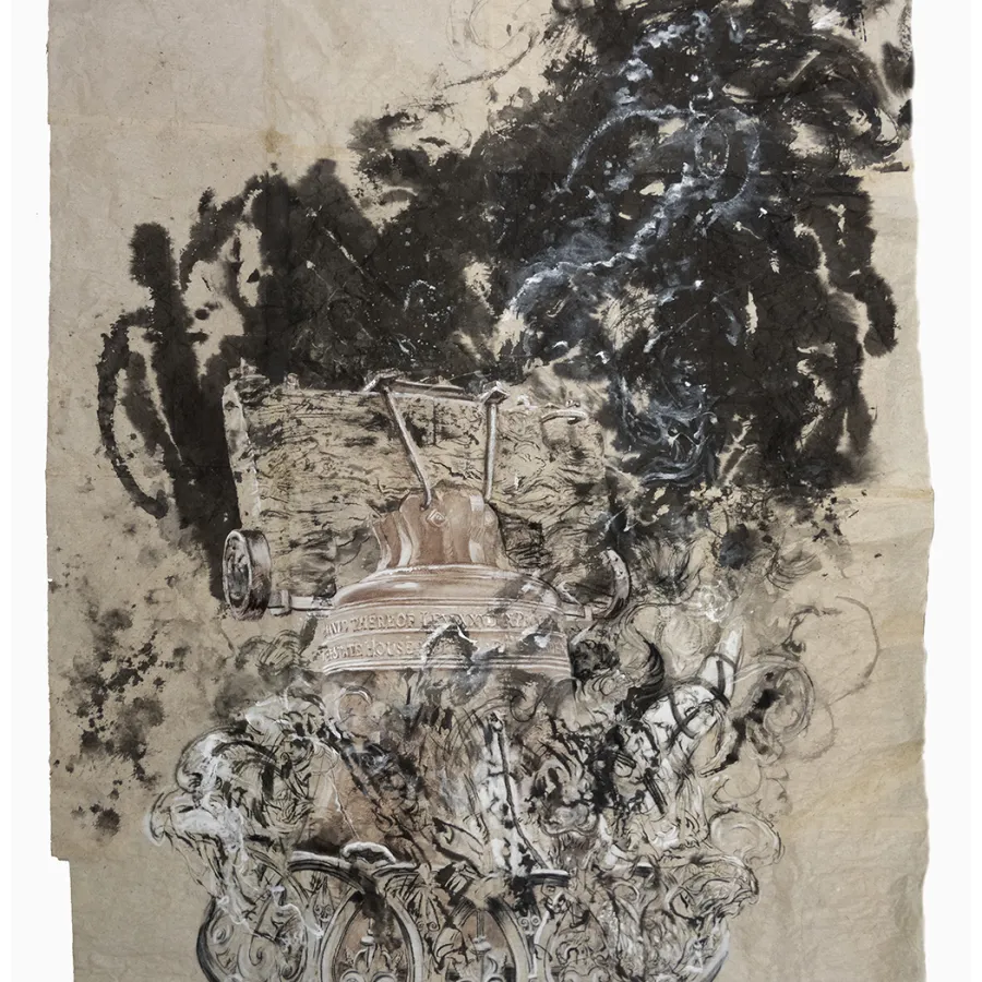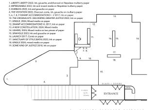 Through a series of ink and mixed media on paper drawings, Johnson dives into the strangeness surrounding contemporary politics and policy in the US. Employing a kind of literalism in his subject matter, his metaphors are almost always a little too on the nose. In his work LIBERTY LIBERTY, Johnson depicts the Liberty Bell snuffing out the torch flame of the Statue of Liberty in a ¾ life sized drawing measuring twelve feet tall. In his work THE ORIGINALISTS: DELIVERING GREATER JUSTICE (2022), Johnson depicts Supreme Court Justices Clarence Thomas, Samuel A. Alito, Amy Coney Barrett, Neil M. Gorsuch, Brett M. Kavanaugh and Chief Justice John G. Roberts performing a cesarian section birth to an incapacitated woman. Ever interested in politics and history, Andrew Ellis Johnson fleshes out a fantastically bizarre set of unrealities. His unrestrained vignettes remind us of political comics, but time and again, there is no punch line, just the punch.