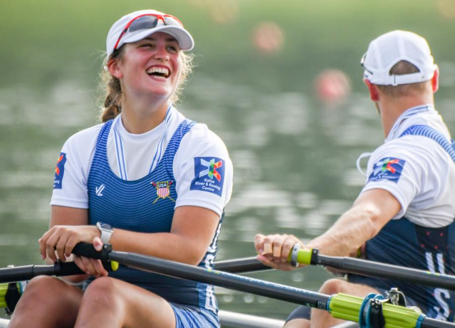 While her peers on the Ithaca College rowing team were returning to campus to begin training for the season, Pearl Outlaw '20, an exercise science major, was already in Linz, Austria, competing at the 2019 World Rowing Championships. She raced in the Paralympic mixed double sculling event and won a bronze medal alongside her partner, Joshua Boissoneau.