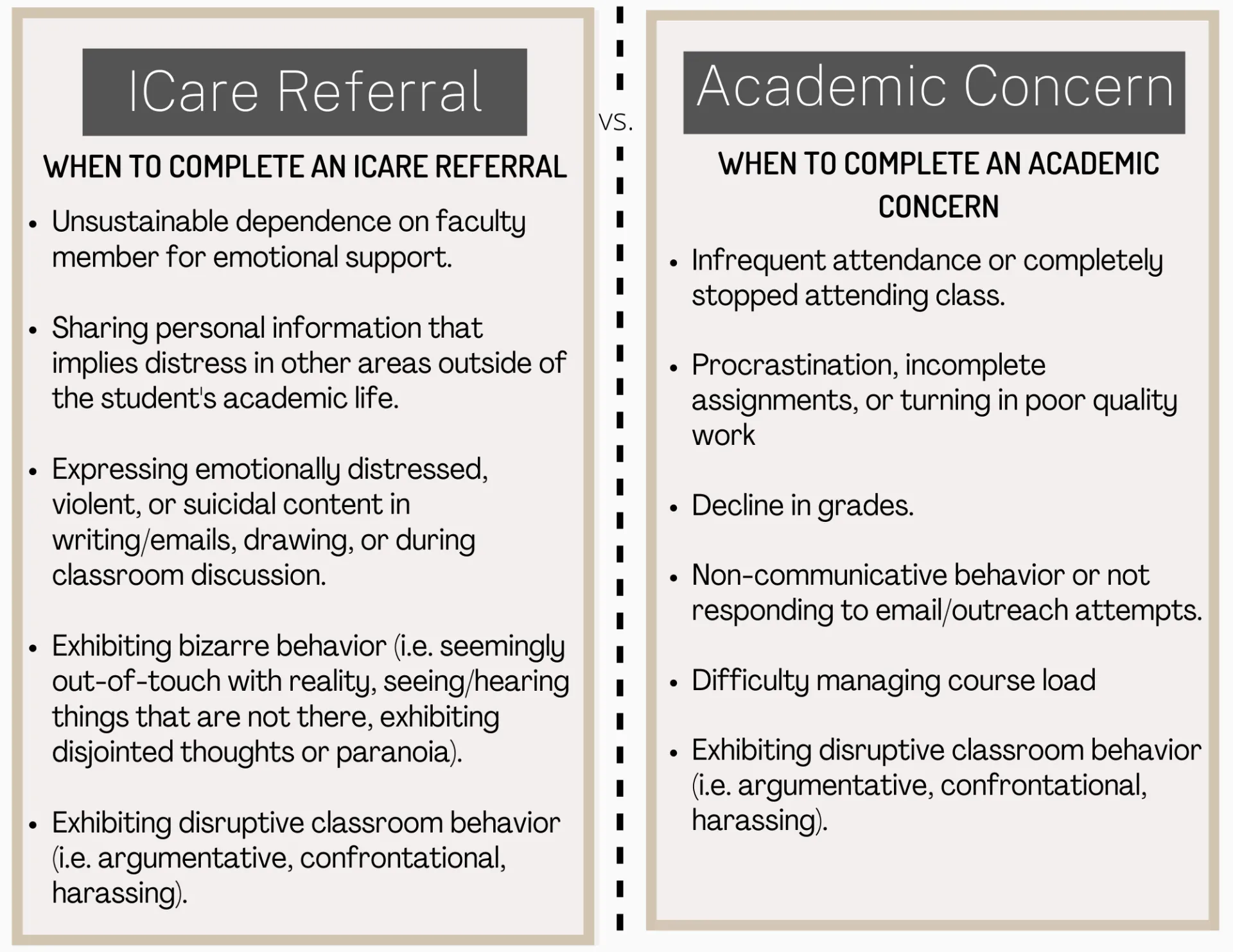 When an ICare Referral is submitted that is solely regarding academic concerns, it will be re-routed to the Academic Concern process. However, due to the review process of ICare referrals this will delay outreach to students in need of support. Please consider your concerns carefully before submitting an ICare referral.