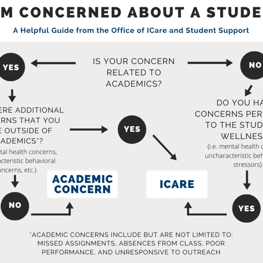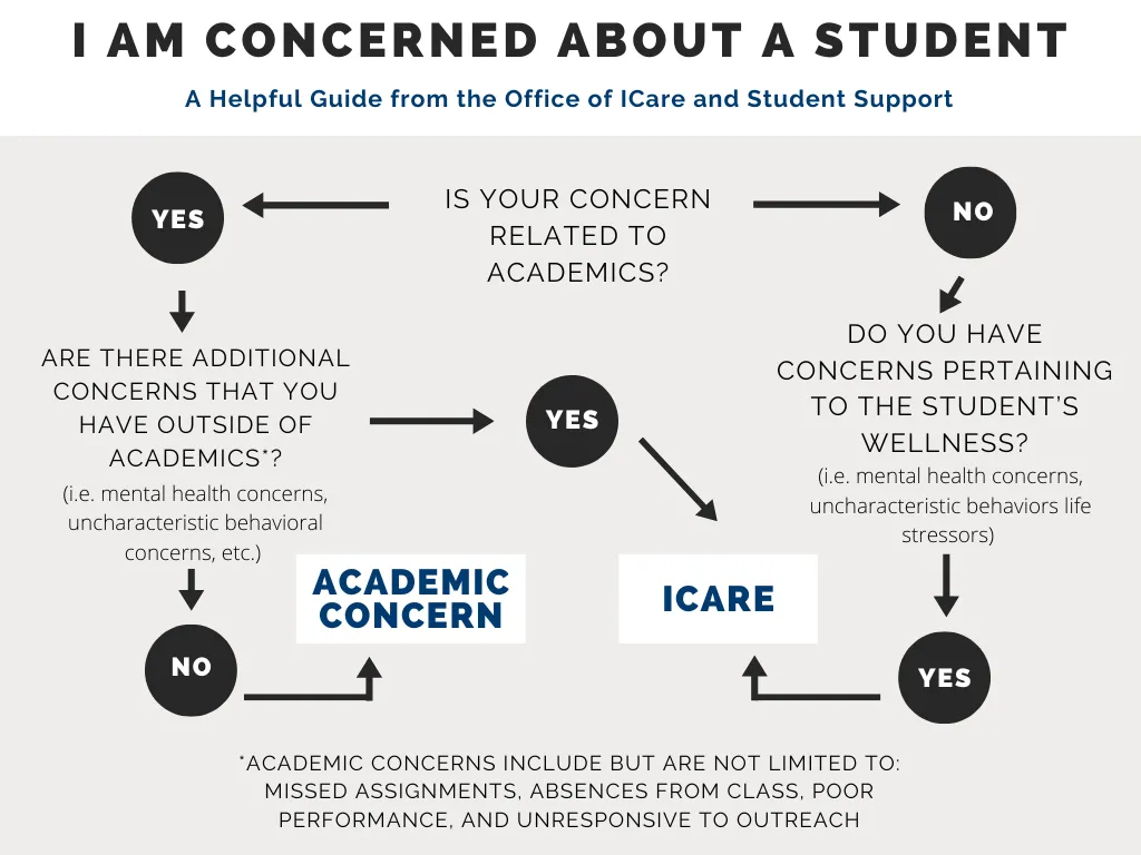 The Academic Concern process is overseen by the Academic Support Center. The Office of ICare and Student Support oversees the ICare referral process.