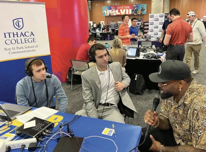 For the four seniors working on IC’s Radio Row Review show while in Phoenix—including television-radio major Dane Richardson and sports media majors Matthew Sosler, Jayden Becker, and Nicholas Lubrano—the trip was a dream come true. IC was one of very few colleges to be invited to work at the Super Bowl’s media center, also known as Radio Row, and the group set up their base alongside national and international news networks to put together five episodes of their show. Content included game discussions, analysis, and interviews with former football players, coaches, and media personalities, as well as coverage of the students’ experiences on Radio Row leading up to the Super Bowl. In addition, WICB aired Big Game Update sportscasts twice every day.