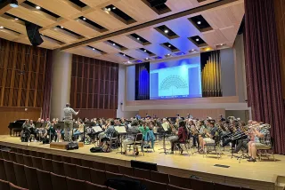 Over 100 alumni from around the country—and beyond—spanning the decades from the class of 1960 to the class of 2022, converged on the Ithaca College campus in June to celebrate 100 years of IC’s bands at the Ithaca College Band Reunion 2022. The ensemble performed in front of an audience of friends and family in Ford Hall in the Whalen Center for Music under the direction of eight different conductors—former, current, and recently hired faculty. Exuberance after the performance was palpable, with animated conversations and groups taking photos both on stage and at the reception in McHenry Lobby. This year’s celebration was IC’s third band reunion. Previous concerts were held in 2010 and 2015.