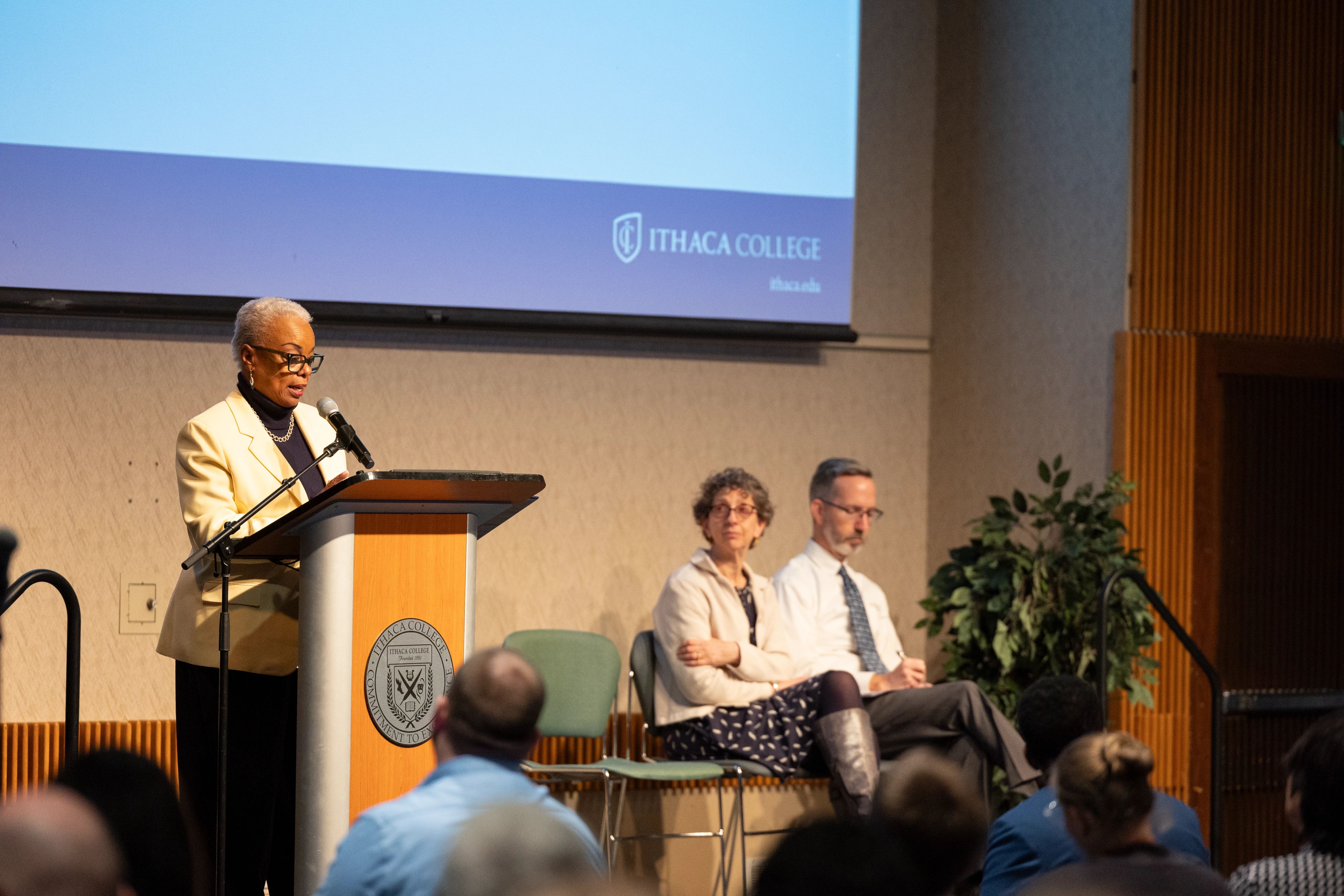 At the spring State of the College gathering on Feb. 11, Ithaca College President La Jerne Terry Cornish and other administrators provided the campus community with an update on plans for eliminating the college’s annual budget deficit.