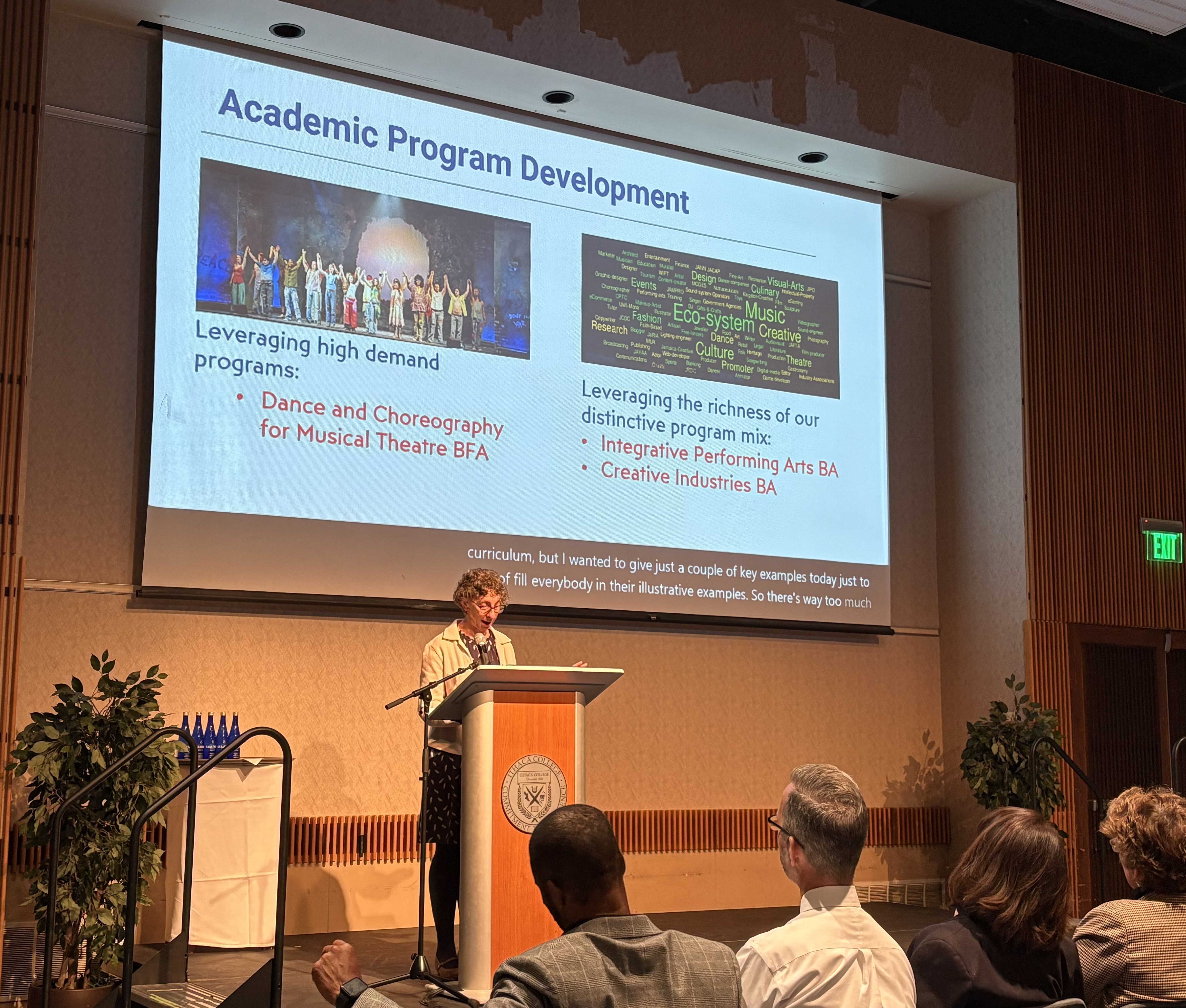 Stein gave as some examples the recently approved degree program in dance and choreography for musical theatre, and potential degrees in integrative performing arts and creative industries, which leverage the college’s academic strengths while helping to expand the applicant pool. She said the college is having discussions with Tompkins Cortland Community College about a dual admission initiative and is looking at ways to improve the overall transfer process.