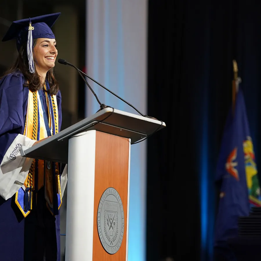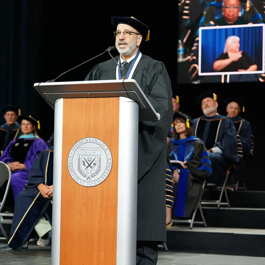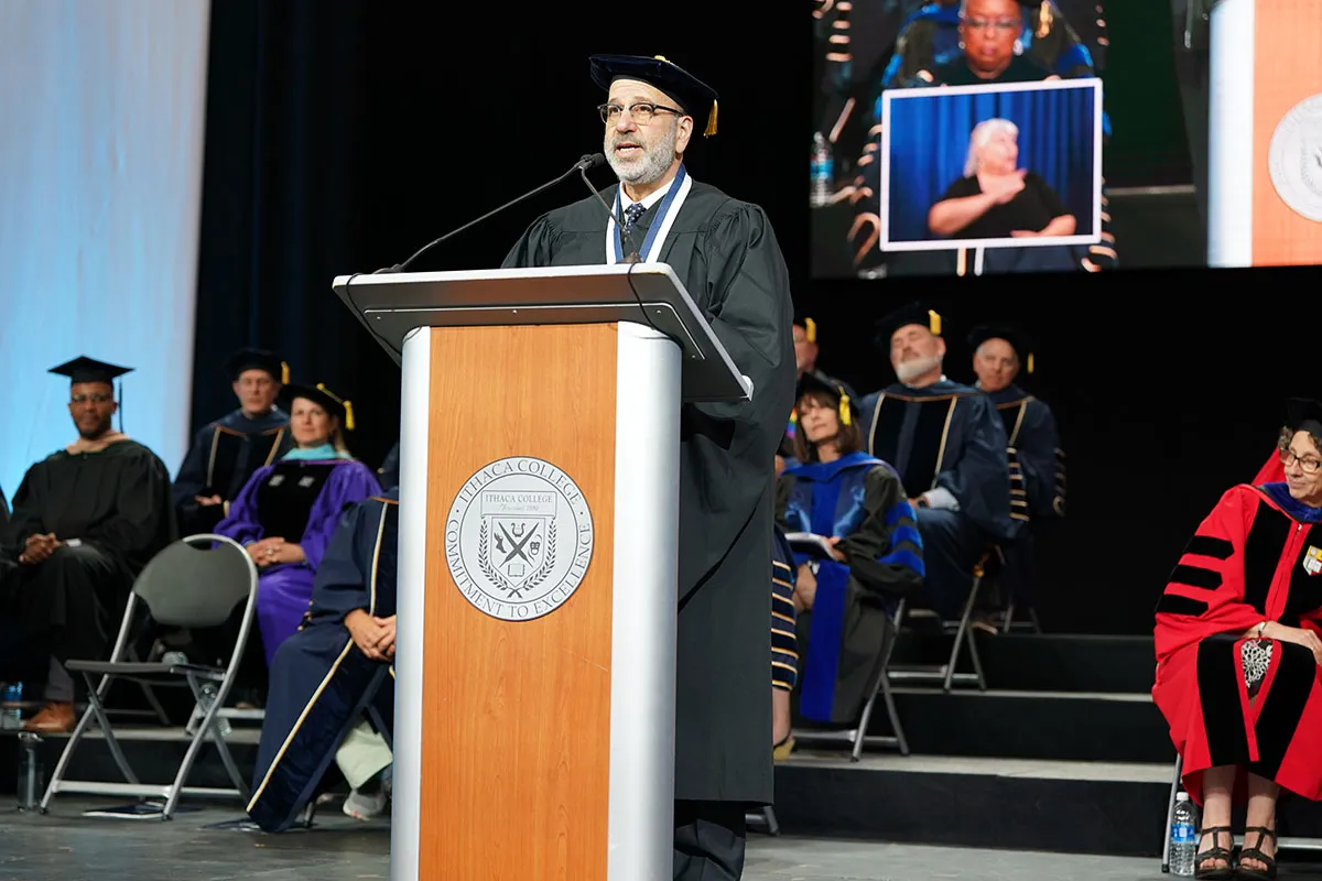 Standing on the stage in Glazer Arena, Tony Award–winning Broadway producer and theatre alum Larry Hirschhorn ’80 confessed to being totally speechless when asked to make Ithaca College’s 128th commencement address celebrating the more than 1,160 members of the Class of 2023.