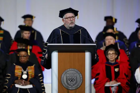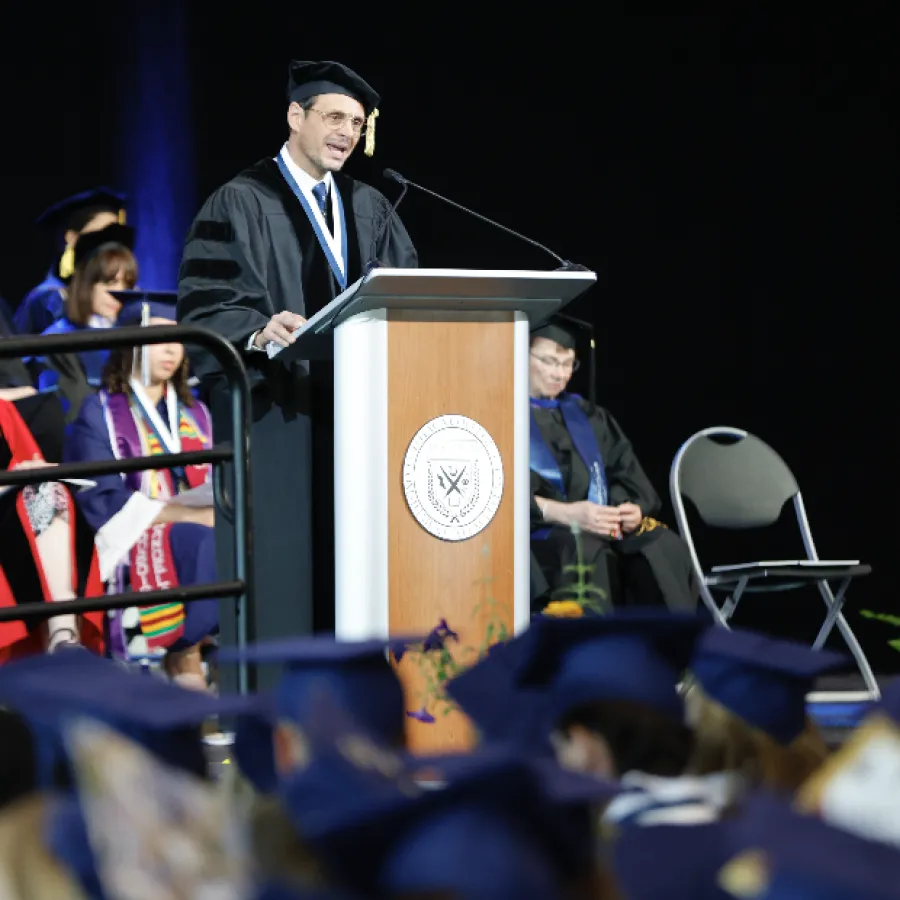 Speaking more than a quarter century after his own Ithaca College graduation, Jason DeLand acknowledged to the Class of 2024 how the world has changed since he crossed the stage in 1998, reminding graduates that they now hold the power to shape the future for all.