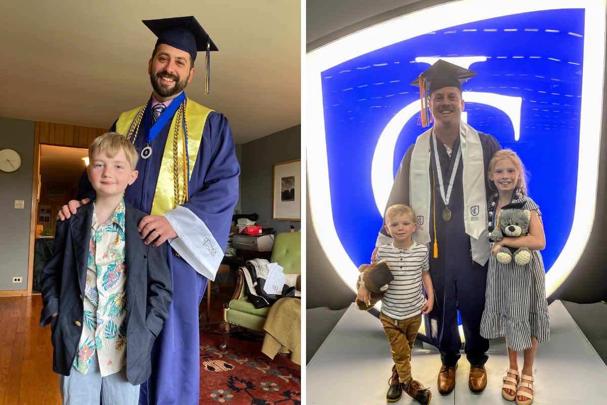 Brindisi and another father, Peter Walz, donned caps and gowns in Glazer Arena in May. They took their time to get across the stage. Decades in fact.