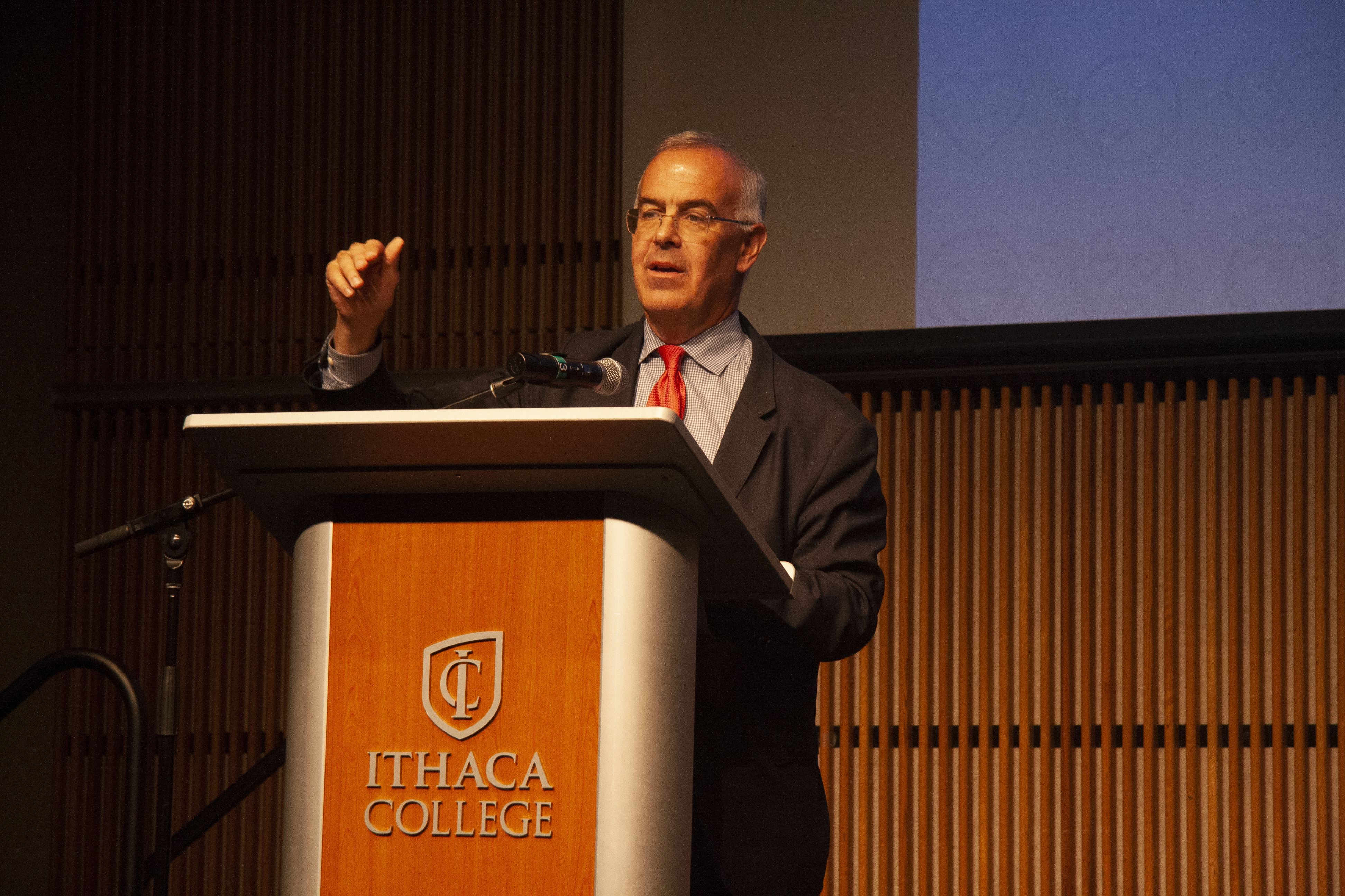 On Thursday, Oct. 4, David Brooks spoke at Ithaca College, urging students to focus on the challenge of finding their post-college identity in an age of fast-paced media.