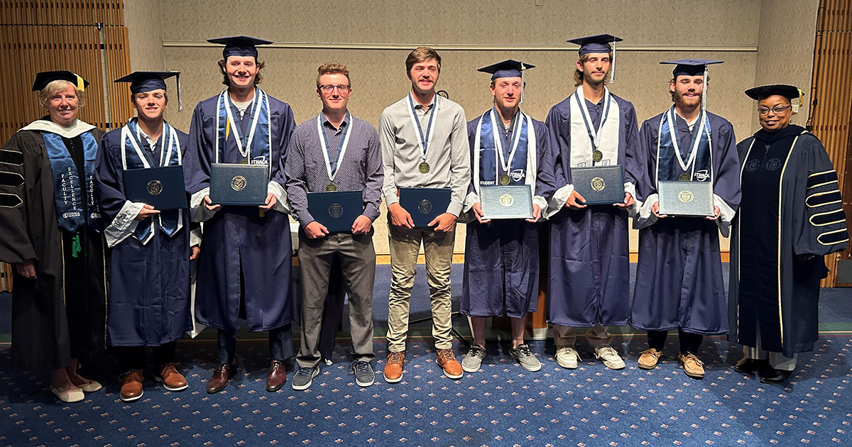 Instead, a few days after slaying the Red Dragons, Natua and six of his teammates — Garrett Bell, Matt Chase, Zane Grimes, David Cifonelli, Kyle Lambert, and Gil Merod — traded their uniforms for gowns and took part in a graduation ceremony in Emerson Suites, where they received their diplomas and medallions from President La Jerne Terry Cornish in front of friends and family.