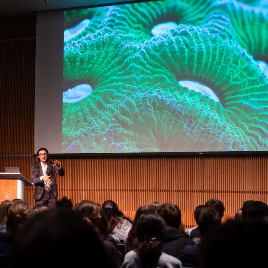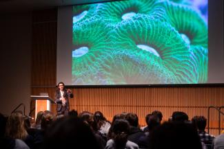 To start the evening, the audience was treated to photos and anecdotes from his time spent filming his documentaries. He described these experiences — which ranged from hiking glaciers in Greenland to document melting, to scuba diving to film time lapses of dying coral reefs — as “both risky and really fun at the same time.”