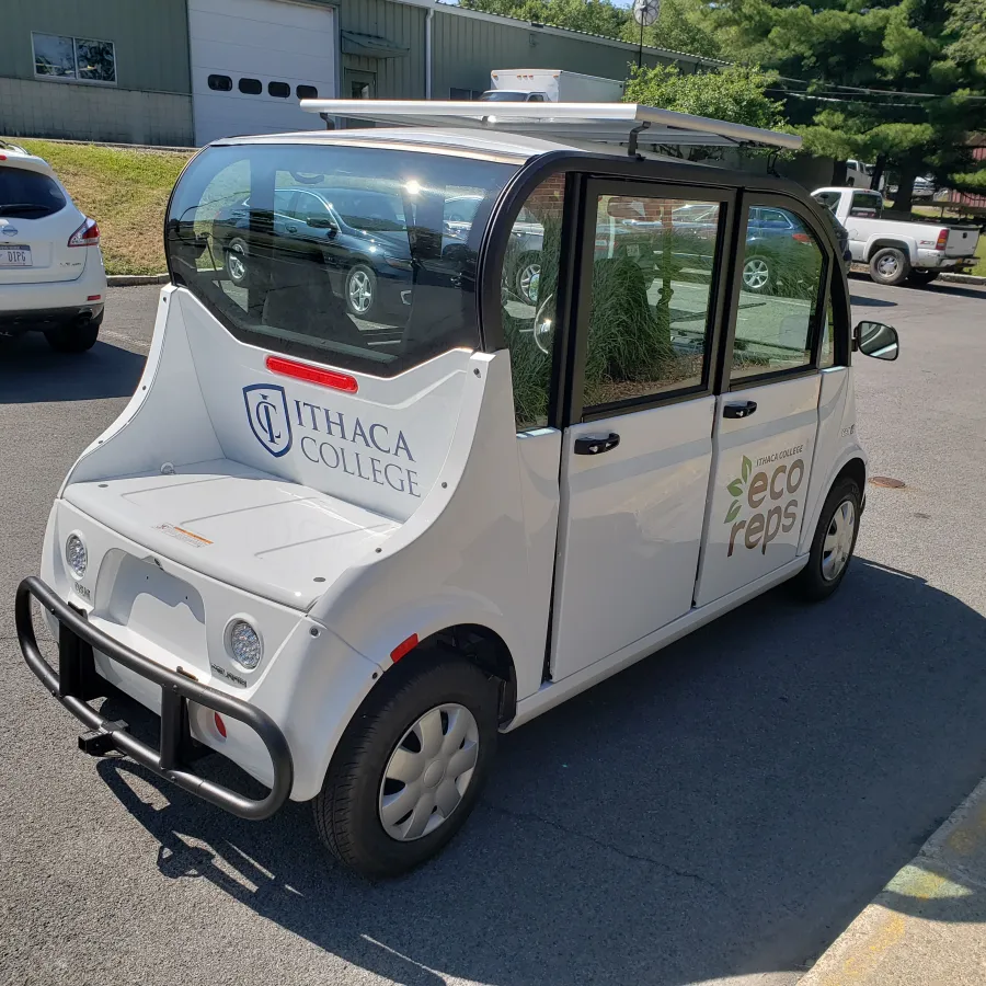 If you’re on Ithaca College’s campus during a sunny day this summer, you’re likely to see a relatively new addition to the school’s fleet of vehicles. In April of 2018, the department of Energy Management and Sustainability purchased a four-passenger, electric and solar-powered vehicle that uses zero fossil fuels.