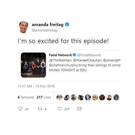 Tasked with creating delicious dishes out of ingredients like popcorn, cinnamon rolls and boniato sweet potatoes, Jason performed dutifully as Amanda’s sous chef, ultimately winning the contest. For their efforts, the Freitags won $10,000 for God’s Love We Deliver, a charity that cooks and delivers nutritionally tailored meals to people in the New York City area who are living with severe illnesses.