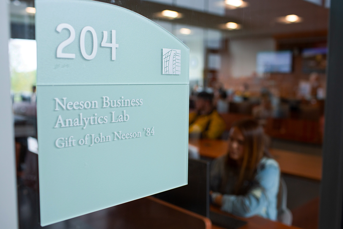 Members of the Ithaca College community convened in the School of Business atrium on Friday, September 27, to celebrate the dedication of the Neeson Business Analytics Lab and the Neeson Digital Marketing and Analytics Lab. The ceremony capped off Professions Week 2019, during which students from all majors were invited to attend panel discussions, presentations, and networking events with industry professionals.