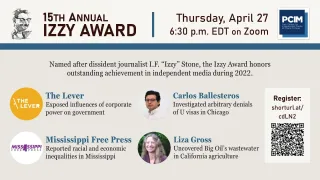 This 15th annual Izzy Award will be shared by nonprofit news outlets The Lever and Mississippi Free Press for exposing government corruption and giving voice to marginalized communities; journalist Carlos Ballesteros for uncovering police and immigration malfeasance; and Liza Gross for reporting Big Oil’s influence on California agriculture.