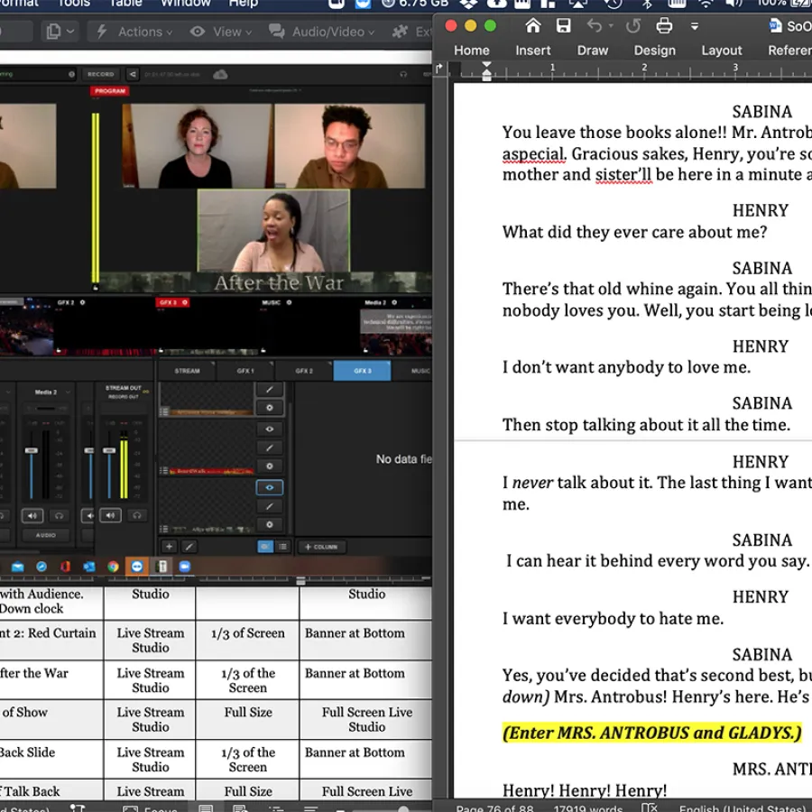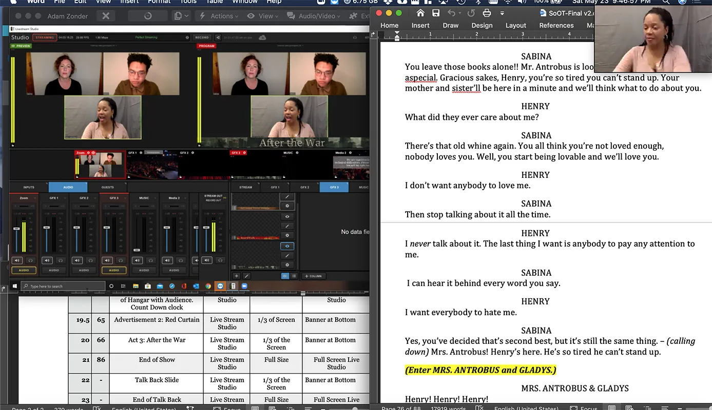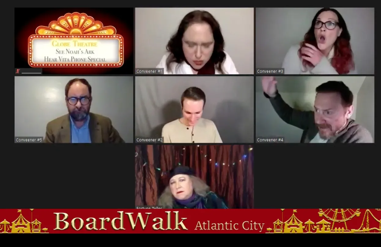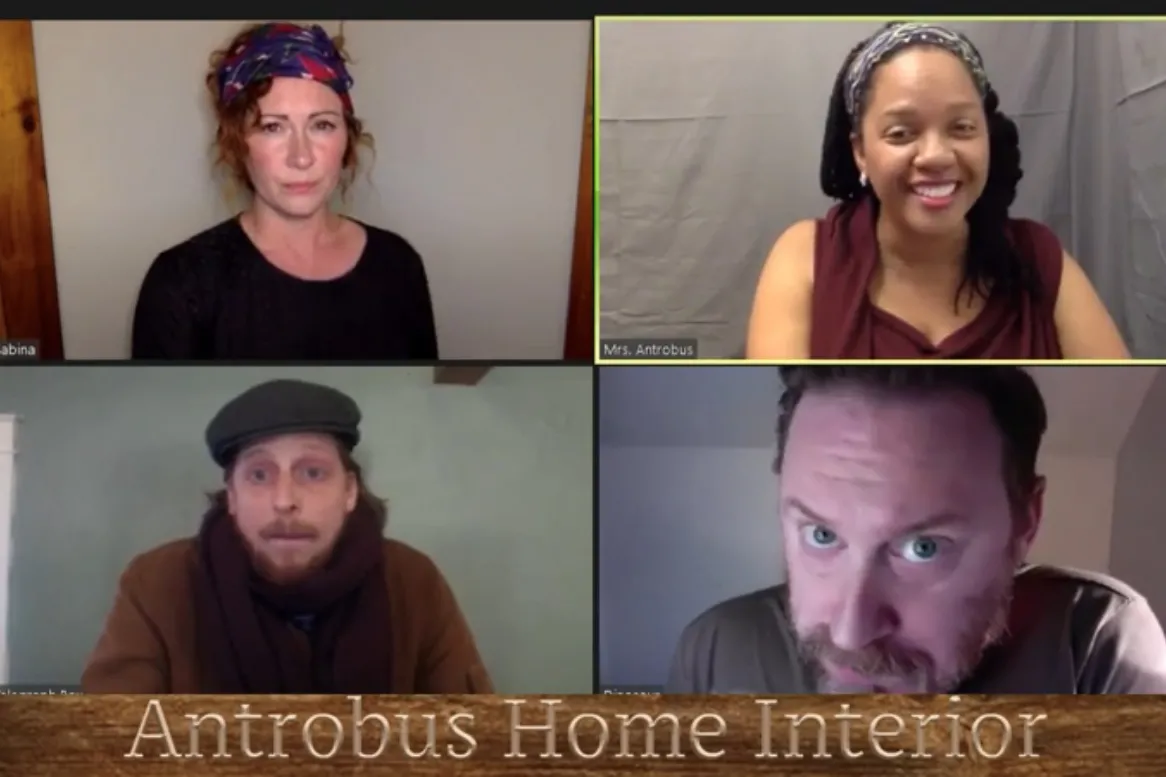 The theatre considered offering a series of online shows, but no one on the staff had experience with virtual production. After collaborating with Ithaca College Associate Professor Chrissy Guest and alumnus Griffin Schultz ’17, however, the Hangar was able to present its first virtual play, “The Skin of Our Teeth,” to more than 400 patrons on May 23.