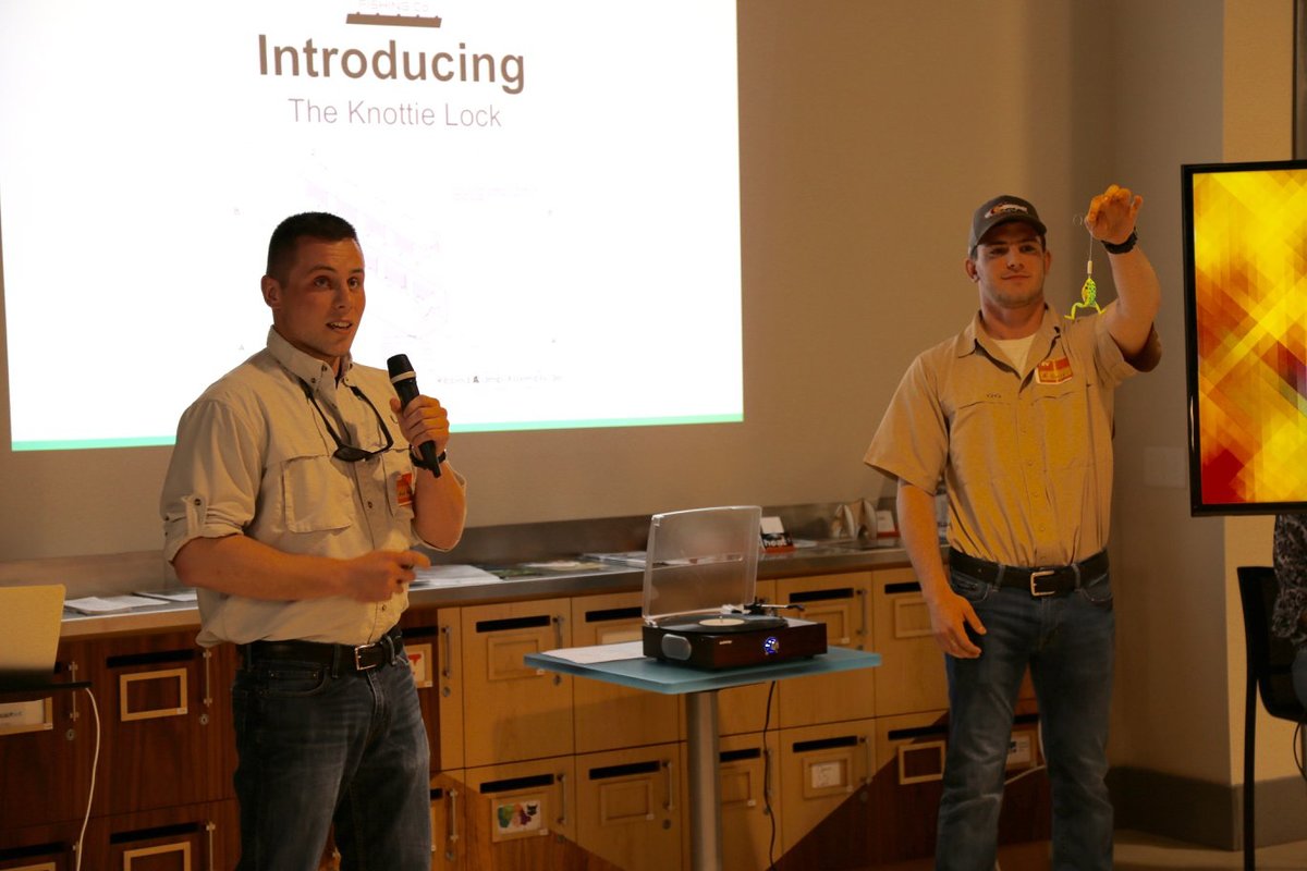Taking home the biggest prize of the night was Knottie Fishing Co., which was award $5,000 and the Judges Prize. Nick Hansen ’18 and Nick Vogel ’18 pitched “The Knottie Lock,” which snaps onto the bottom of a fishing line and holds it in place, eliminating the need for complicated fishing knots to hold lures and hooks, and should benefit many individuals.