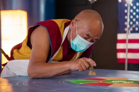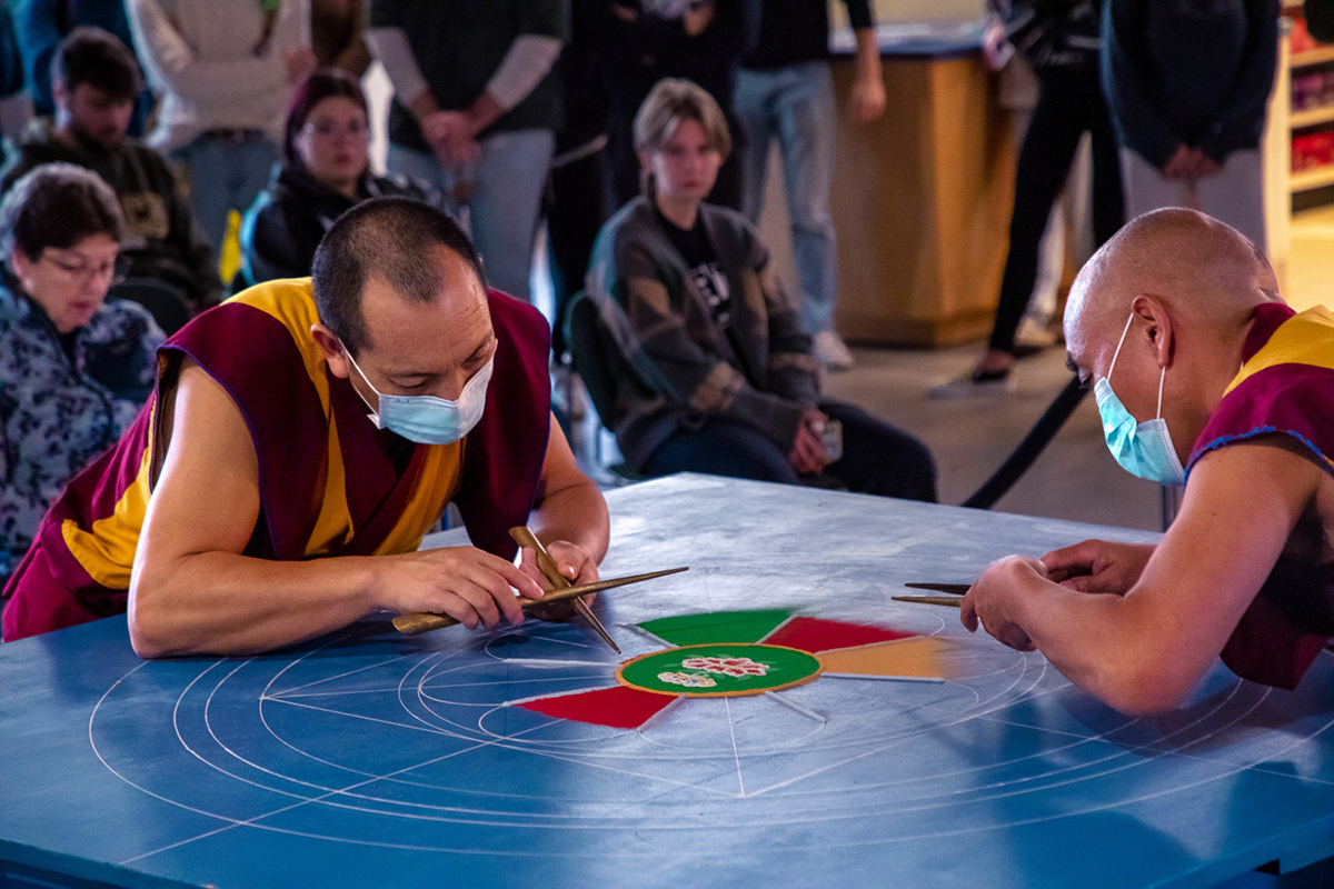 It’s midday on Thursday, November 3, and the Campus Center lobby is typically busy as students, faculty, and staff make their way to and from lunch and class. In contrast to the bustle, two Tibetan monks from the Namgyal Monastery Institute of Buddhist Studies—Ithaca College’s neighbor on South Hill—are calmly bending over a five-foot square table, painstakingly sprinkling grains of colored sand into place in the construction of a mandala.