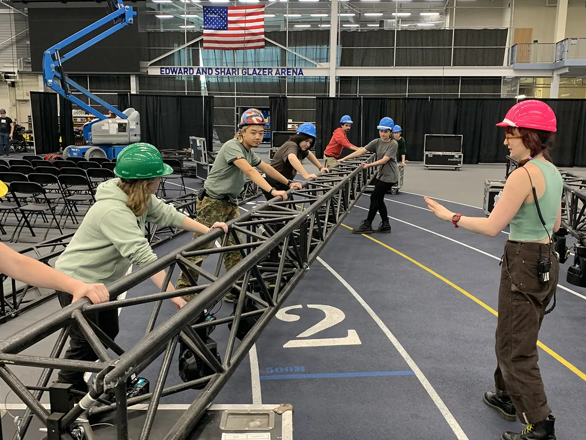 Lead rigger Lavender Pyzowski ’24 was responsible for making sure equipment was installed in the arena safely. Garrett’s technical crew worked throughout the week to unload and get fully set up in the space. Jobs included ensuring proper rigging of the trussing and making sure it all worked; measuring to double check the layout; taping out and loading the seating and loading the stages; hanging the curtains and the IC seal; and hanging and rigging the video walls and audio system. Including the time spent striking everything after the event, Garrett calculated a total 700 hours of labor—all outside of class.