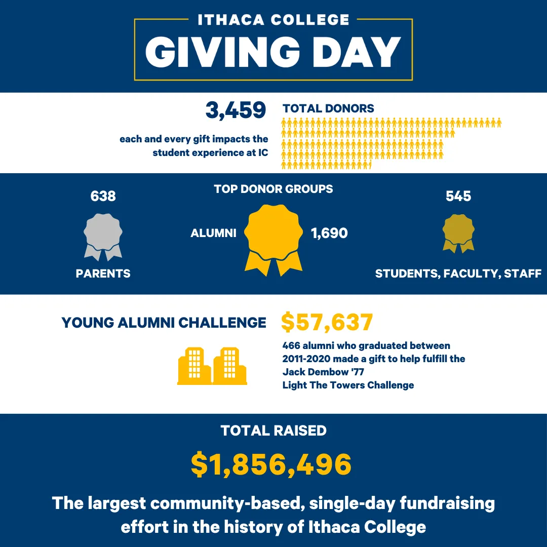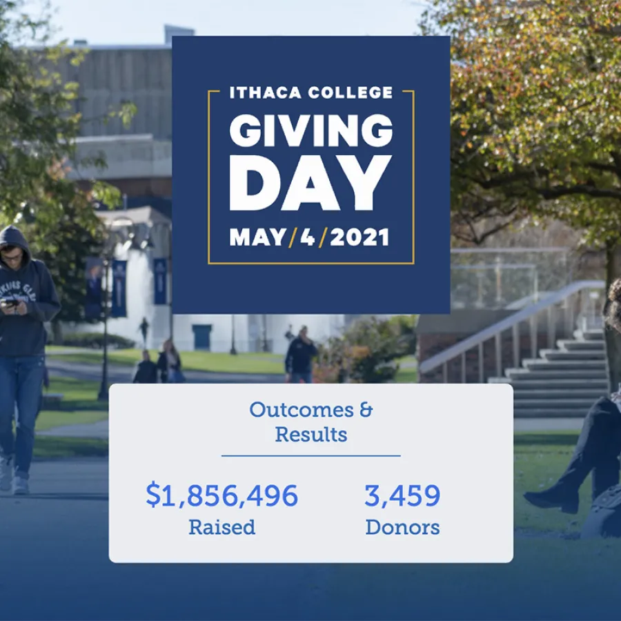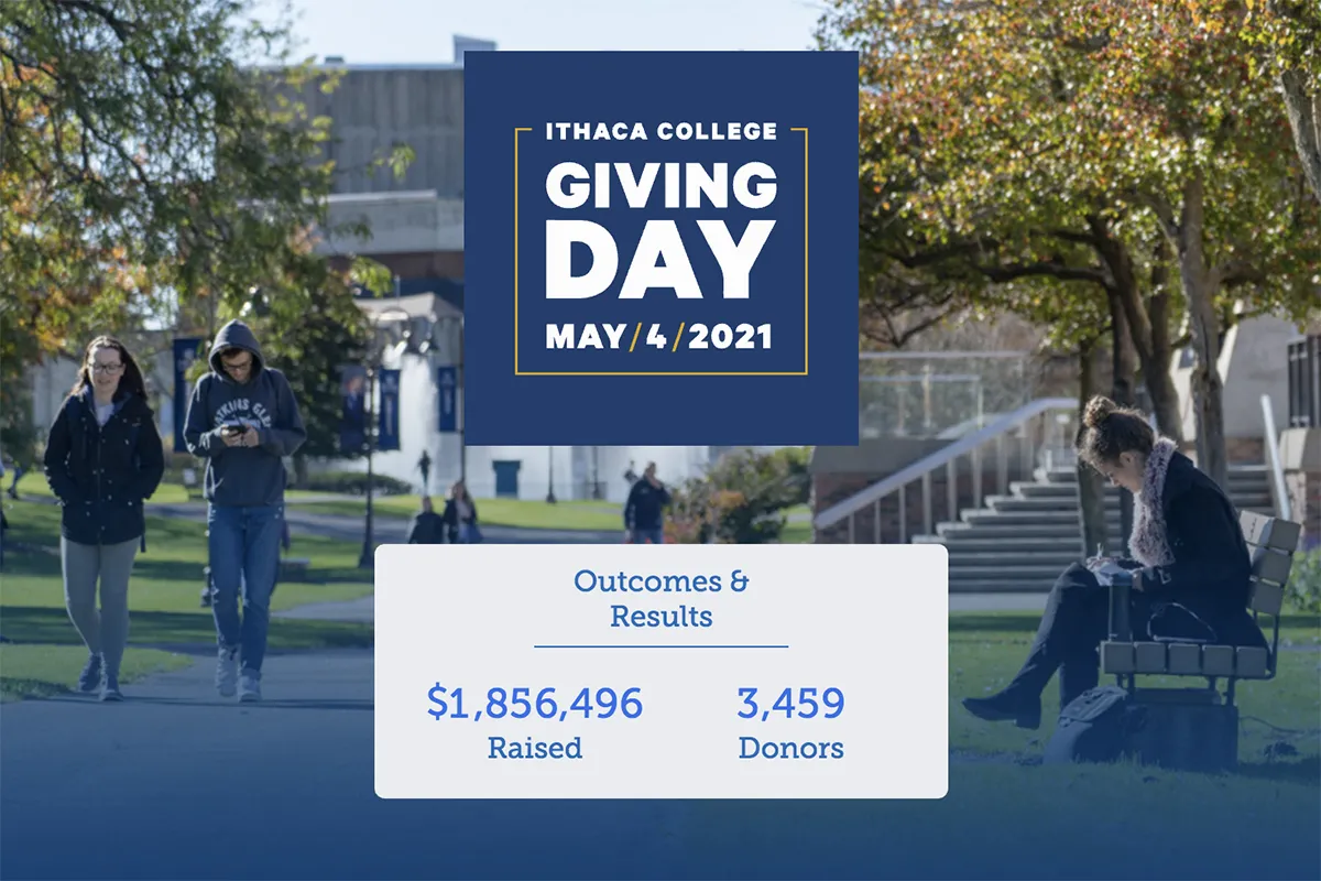 On Tuesday, May 4, more than 3,450 Ithaca College students, alumni, faculty, staff and supporters demonstrated their collective love for IC by coming together to raise a record-breaking $1.85 million in support of the institution during Ithaca College Giving Day. This 24-hour fundraising initiative gave community members the opportunity to show their love for the aspects of the IC experience that are closest to their hearts. Donors contributed to all five schools, specific departments, IC athletics teams, and student organizations and clubs.