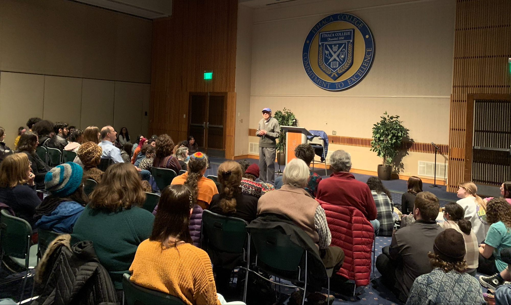 Rind was talking to a room of close to 200 students, faculty, and staff in Ithaca College’s Emerson Suites on February 1. An animated and lively speaker, Rind has been sharing his personal experiences as a Holocaust survivor for a quarter century.