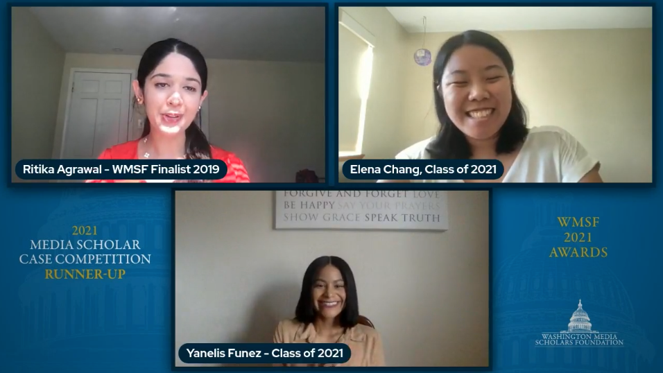 Integrated Marketing Communications major Elena Chang ’21 took home second place in the 2021 Washington Media Scholars Foundation Media Case Plan Competition with her partner Yanelis Funez, a student from Pennsylvania State University.