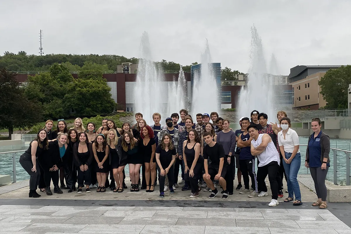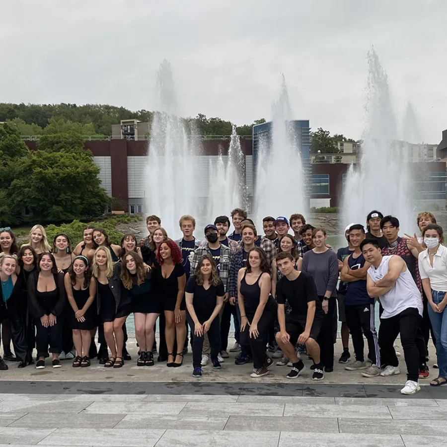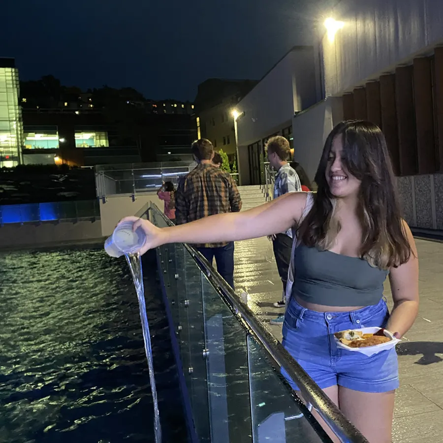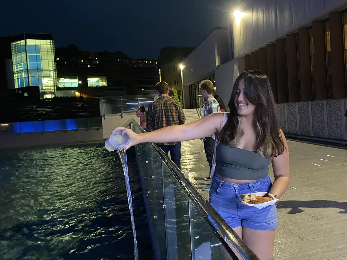 A bit of rain couldn’t ruin last weekend’s Fountain Fest, the iconic closing to Ithaca College’s First Bomber Weekend.On Saturday, September 4, dozens of first-year students walked to the college’s fountains at Dillingham Center, where they were able to play their part in filling the fountains by pouring in a cup of water.