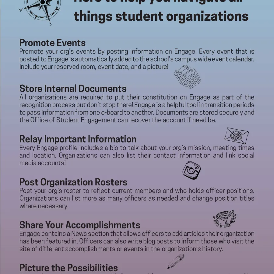 Student organizations can use Engage to maintain their operations, communicate internally, and reach out to prospective new members. The site has many features that make organization management easy!