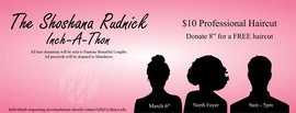 Every year Hillel hosts The Shoshana Rudnick Inch-a-thon, a fundraiser to support cancer patients - we collect hair, and donations. If you donate more than 8 inches of hair – we will give you a free haircut and the hair is donated to Pantene Beautiful Lengths. If you just want a professionally done haircut, or hair-style – we can do that as well all the proceeds are given to Sharsheret a national not-for-profit organization supporting young Jewish women and their families facing breast cancer.