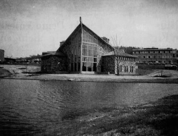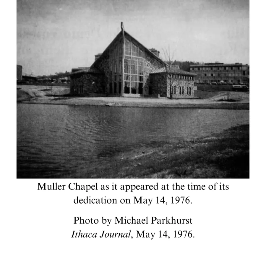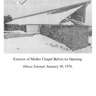 While the space in the Rowland Hall basement provided areas for pastoral counseling and programming for nine years, by 1960 some members of Ithaca College’s Board of Trustees were already discussing the creation of a designated chapel on the South Hill campus.35 It was initially announced in April 1960 that a chapel would be opened at Ithaca College by 1966.36 Key among those individuals who advocated for the creation of a chapel was Herman E. Muller. Muller, who served as chairman of the Ithaca College Board of Trustees from 1950 until his death in 1965, became interested in funding the creation of a chapel at Ithaca College in part after learning that federal and state building grants could not be utilized for this purpose.37 Plans did not begin to be created for the chapel, however, until 1973.38 More will be written about this in the next section.